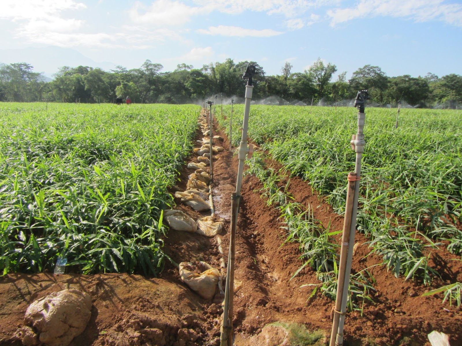 El 1 de abril de 2015 visitamos nuevamente el jengibre plantado cerca de nuestra universidad. Era la sexta visita, desde la siembra el 27 de diciembre de 2014. El primero de abril, en cambio, la plantación estaba descubierta. El plástico que cubría toda la plantación, cinco semanas antes (24 de febrero de 2015) finalmente había sido retirado. La labor de esta semana era relleno y aporco.
